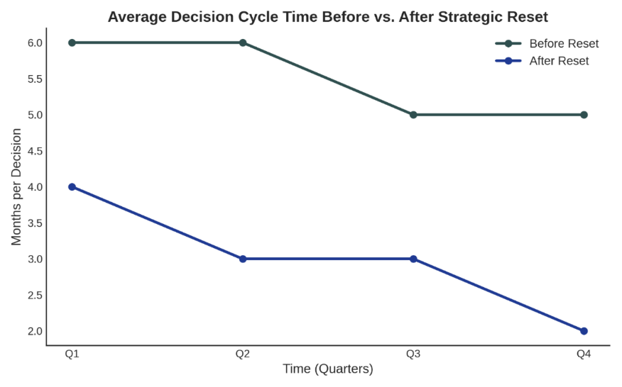 In organizations where strategy execution is faltering, decision cycle times increase by 30–50% within 12–18 months of a new strategic push. More decisions escalate upward. Fewer are resolved at the right level.
