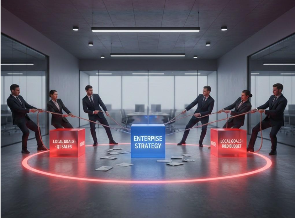 In organizations where strategy stalls, less than 40% of senior leaders’ incentives are tied to enterprise-wide outcomes. The remainder reinforce functional or local optimization.